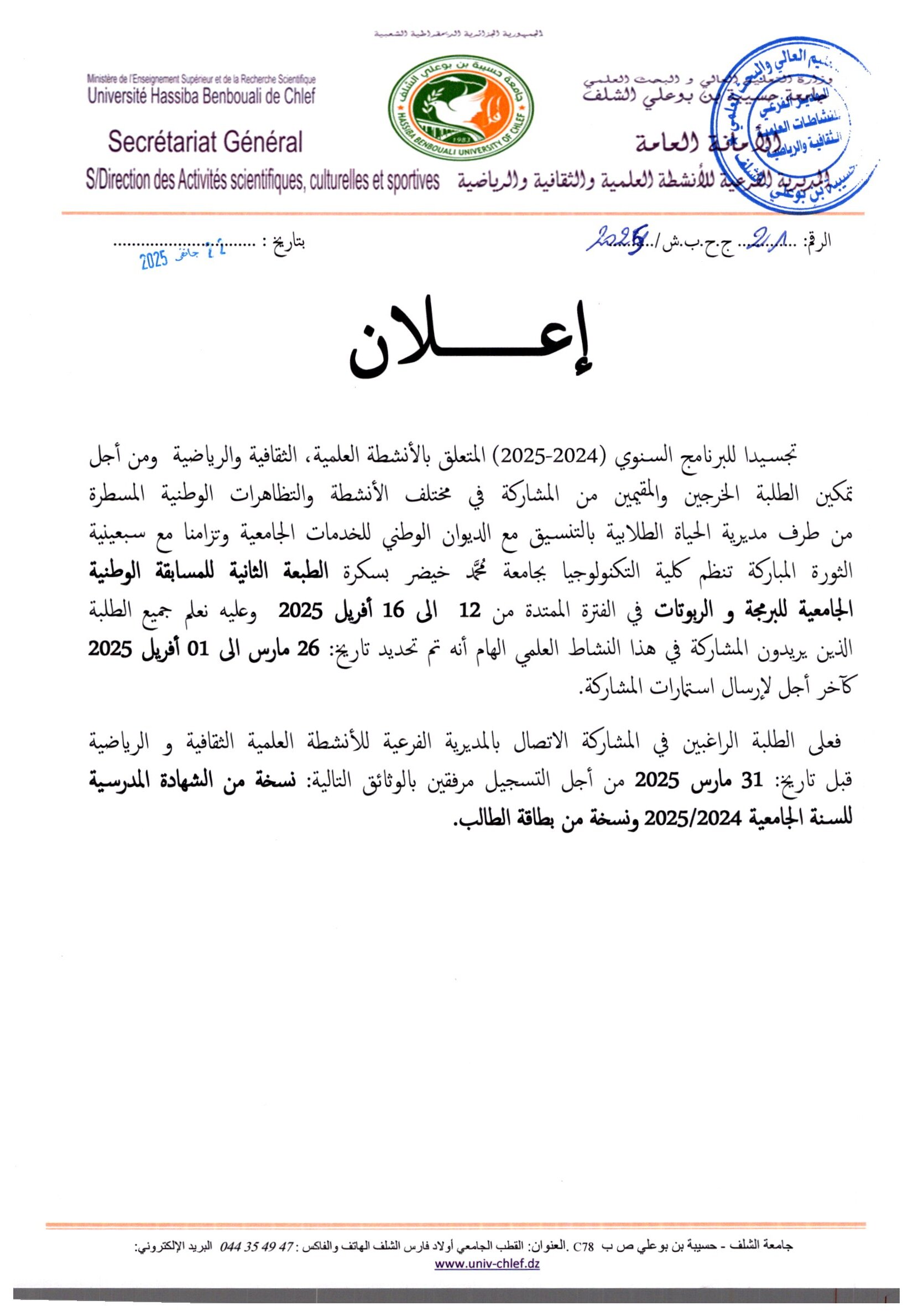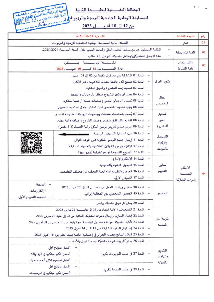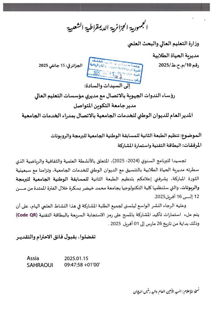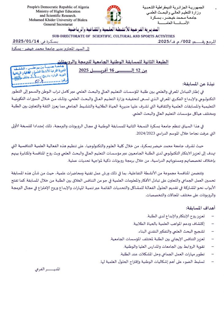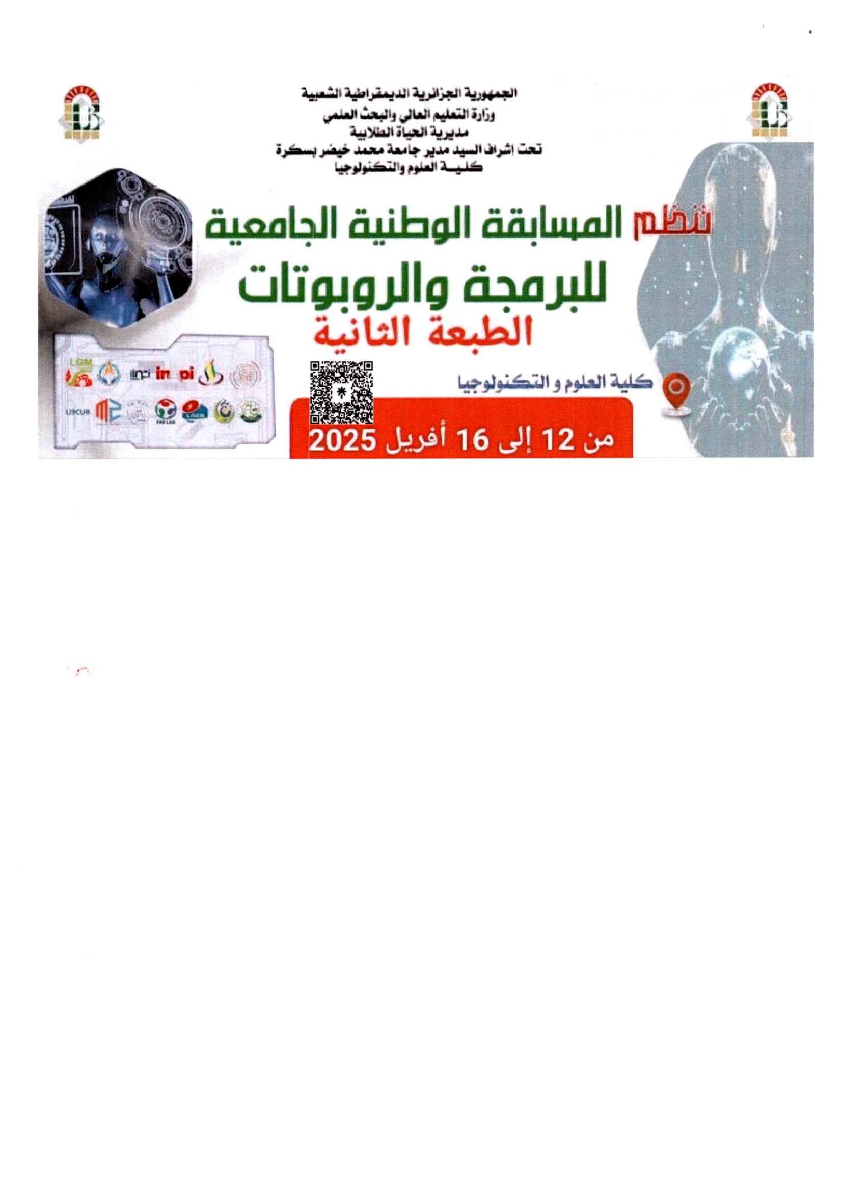 المسابقة الوطنية الجامعية للبرمجة و الروبوتات (الطبعة الثانية)بواسطة zouatenia mhamed / 23 يناير، 2025