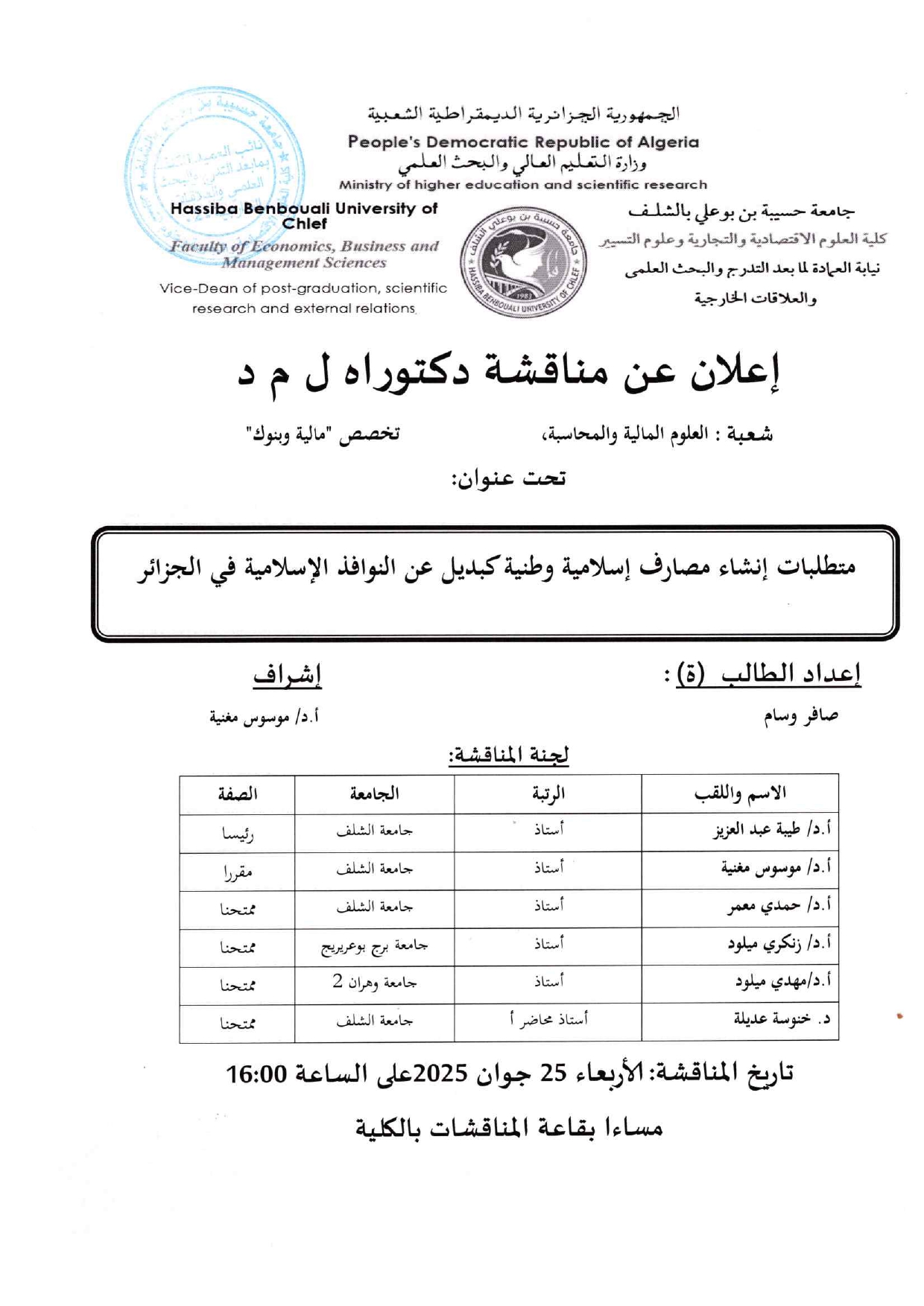 اعلان عن مناقشة دكتوراه LMD: متطلبات انشاء مصارف اسلامية وطنية كبديل عن النوافذ الاسلامية في الجزائربواسطة zouatenia mhamed / 18 يونيو، 2025 اعلان مناقشة صافر وسامتنزيل