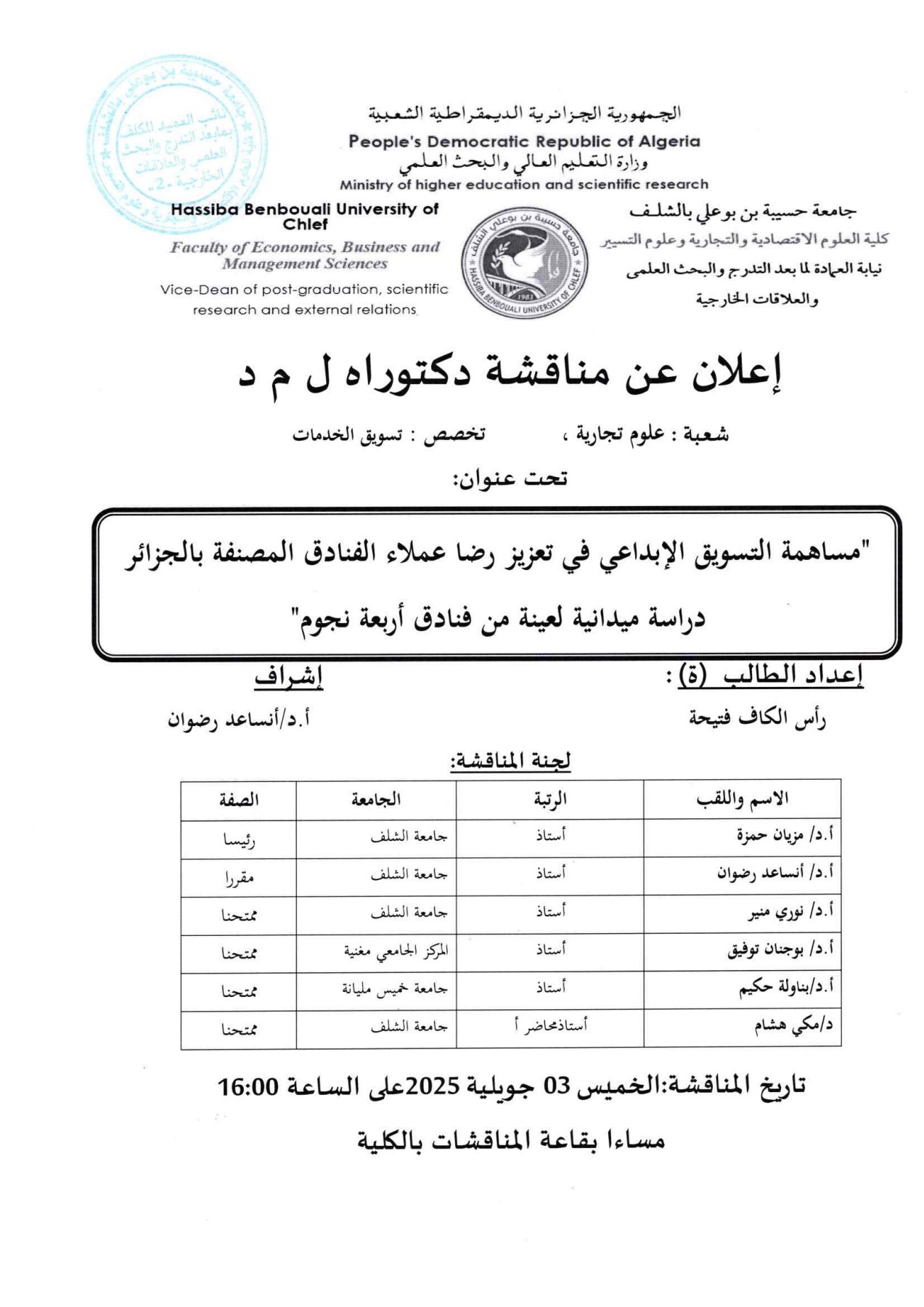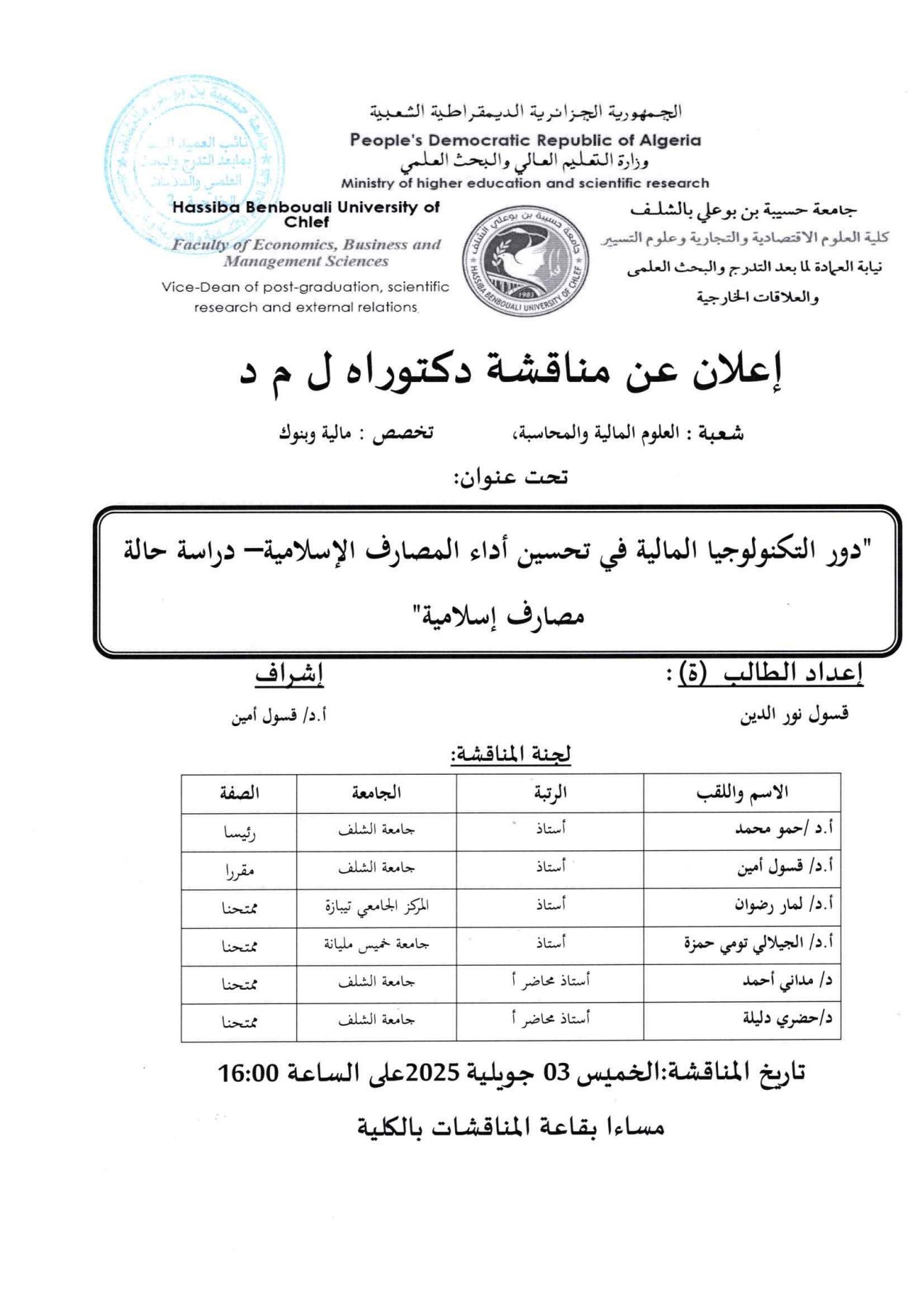 اعلان عن مناقشة دكتوراه LMD: متطلبات ضبط البدائل المحاسبية للحد من ممارسات المحاسبة الابداعية – دراسة حالة مجموعة من المؤسسات الاقتصادية-