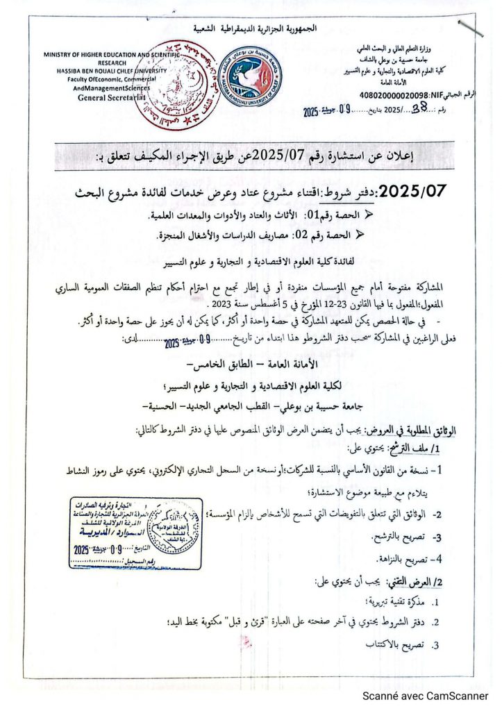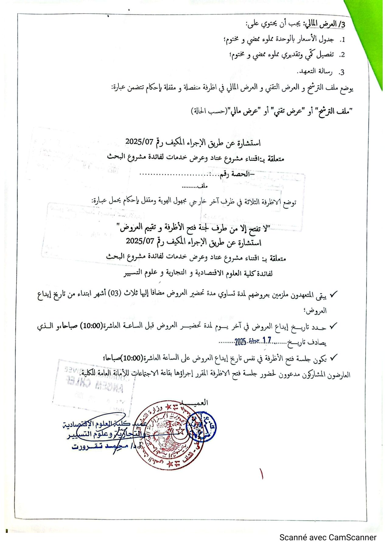 اعلان عن استشارة رقم 07/2025 عن طريق الإجراء المكيف تتعلق ب اقتناء مشروع عتاد و عتاد وعرض خدمات لفائدة مشروع البحثبواسطة zouatenia mhamed / 9 يوليو، 2025 استشارة رقم 07 (.pdf)تنزيل