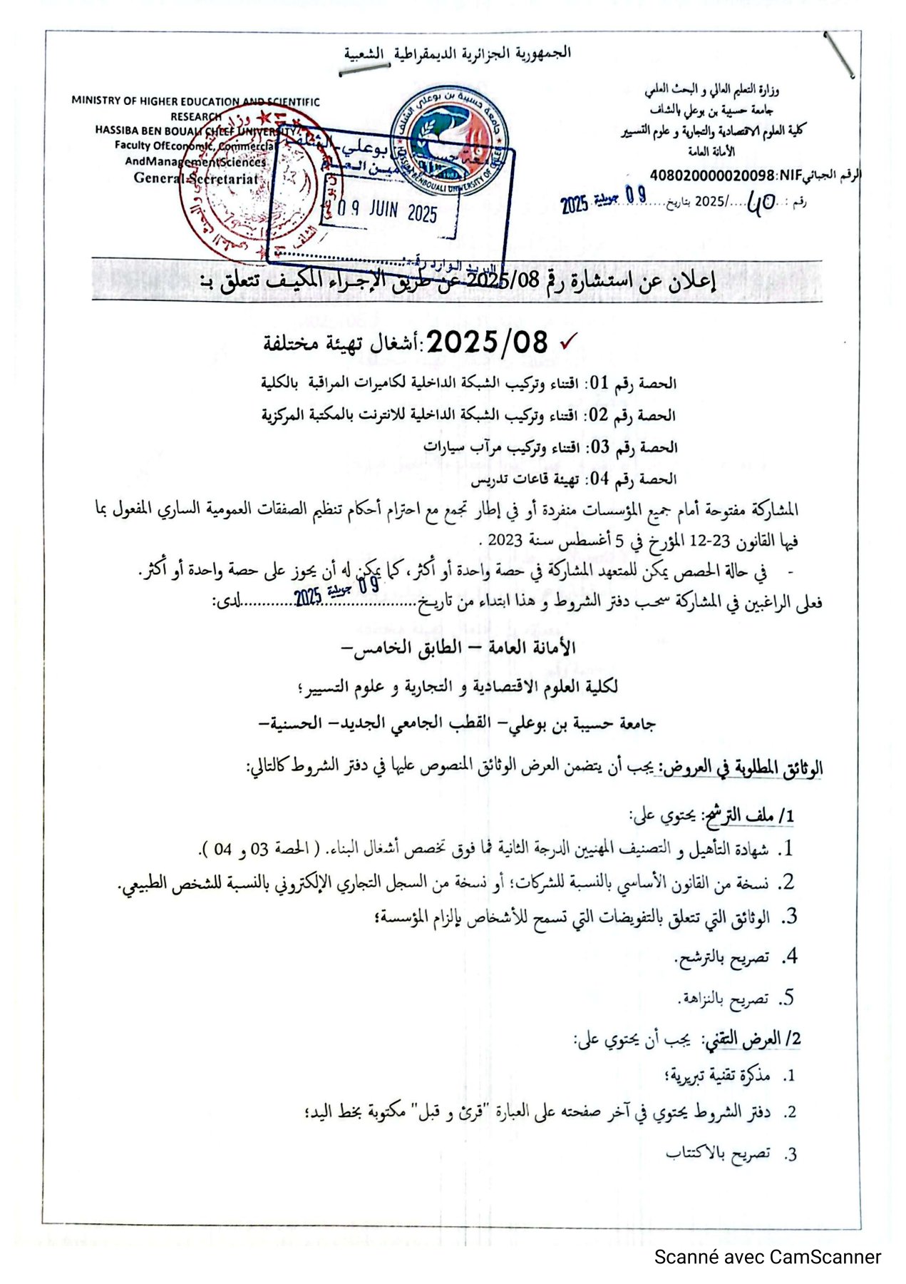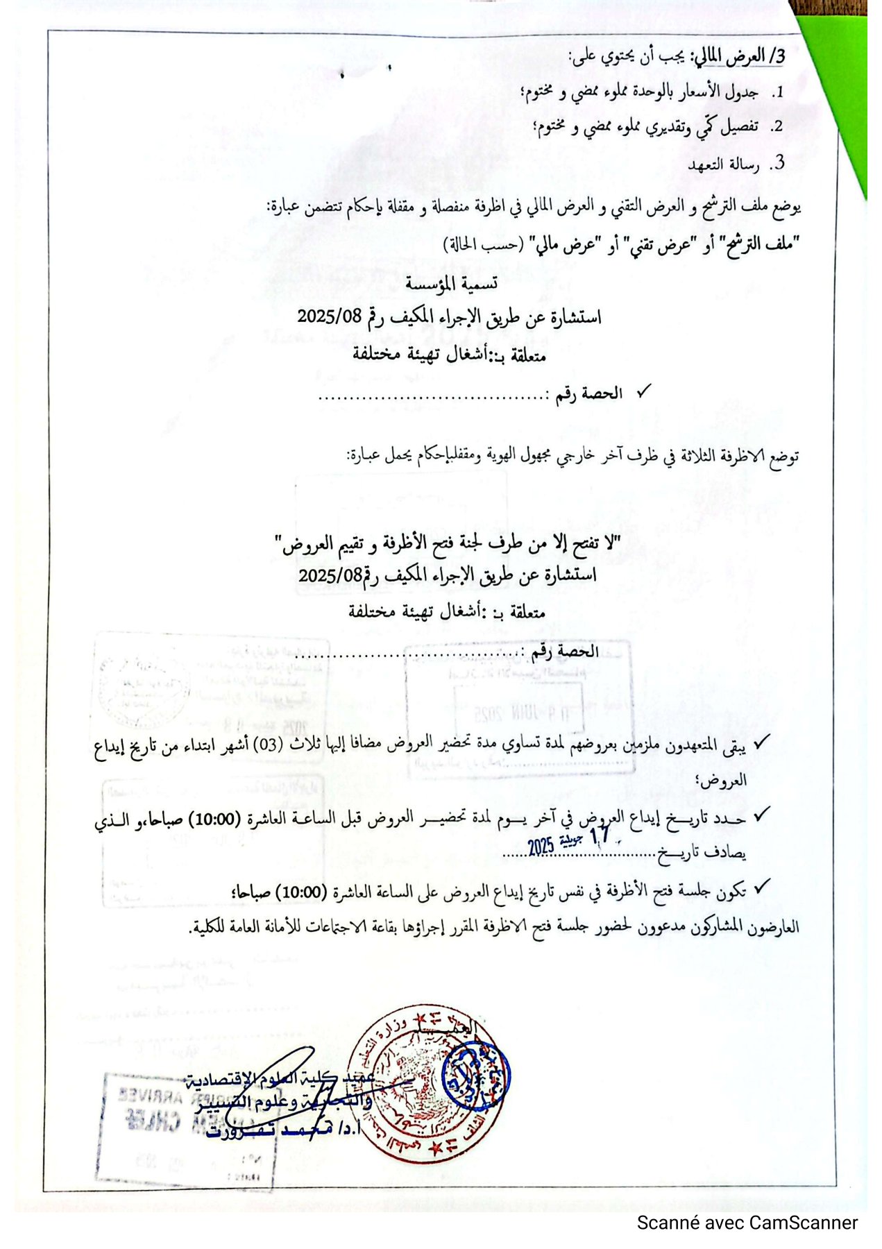 اعلان عن استشارة رقم 08/2025 عن طريق الإجراء المكيف تتعلق ب: أشغال تهيئة مختلفةبواسطة zouatenia mhamed / 9 يوليو، 2025 استشارة رقم 08 (1)تنزيل