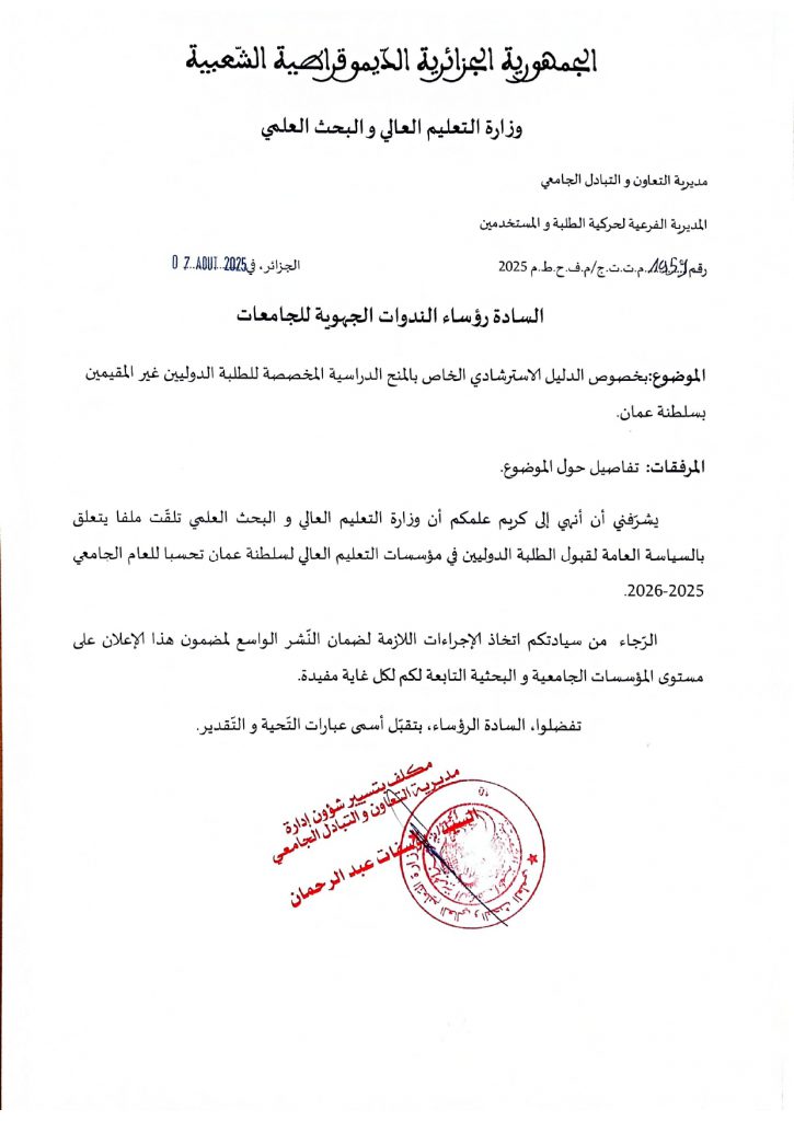 دليل الطالب للالتحاق بمؤسسات التعليم العالي للطلبة الدوليين الغير مقيمين -سلطنة عمان-بواسطة zouatenia mhamed / 11 أغسطس، 2025 اضغط هنا لتحميل الملفتنزيل