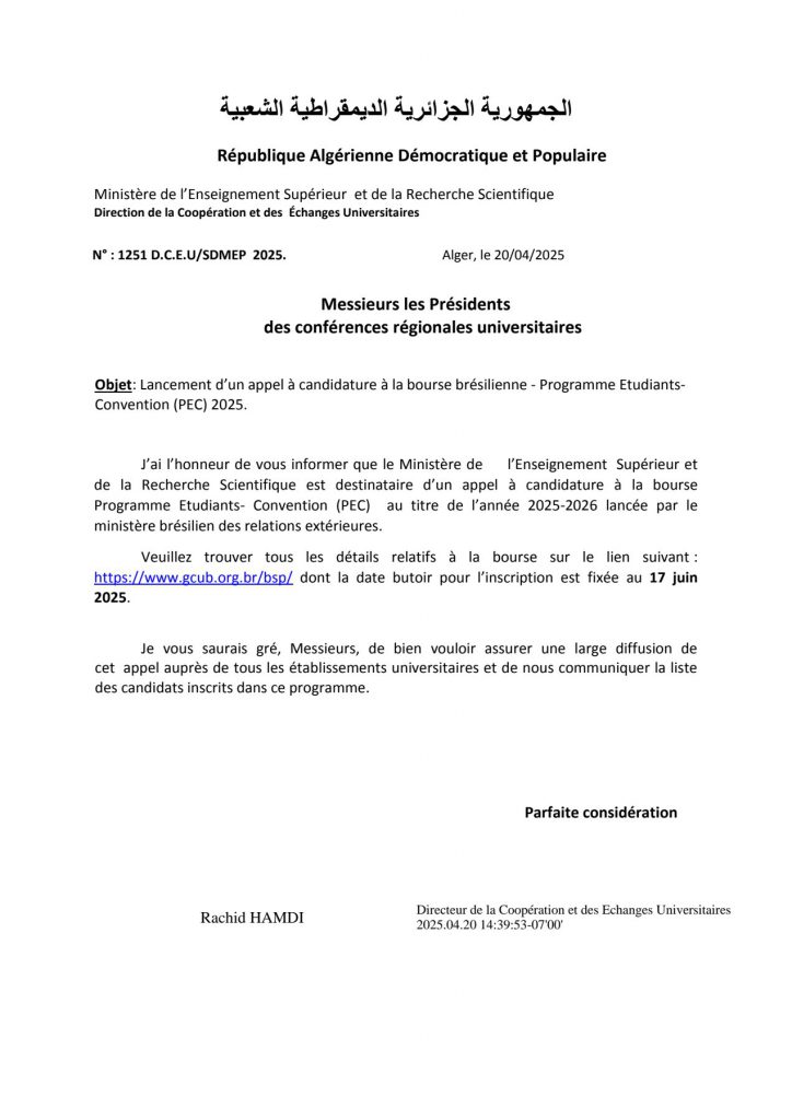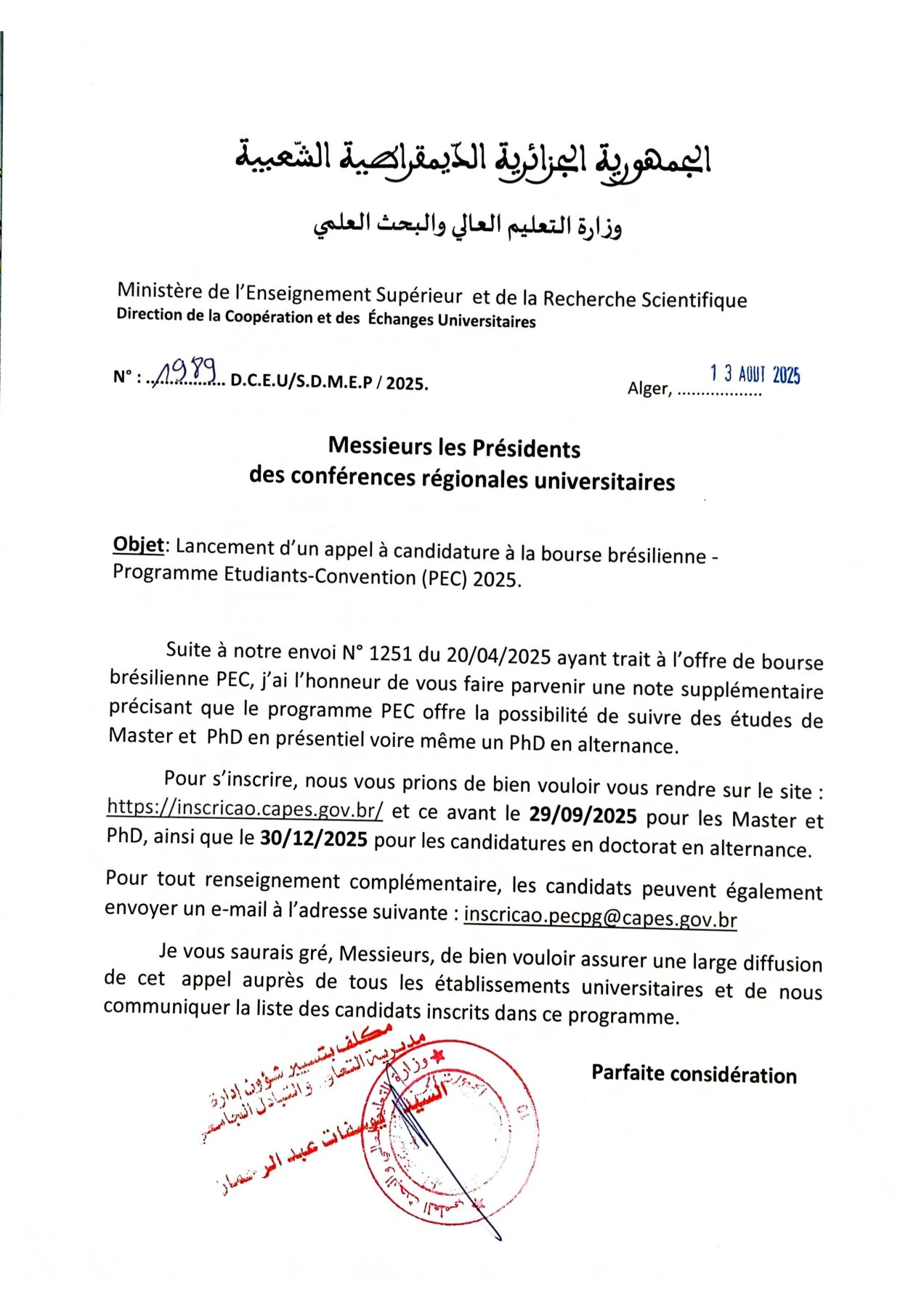 أعلنت جامعة حسيبة بن بوعلي بالشلف، عن فتح باب الترشح للاستفادة من برنامج المنحة البرازيلية (PEC) للدراسة في البرازيل.