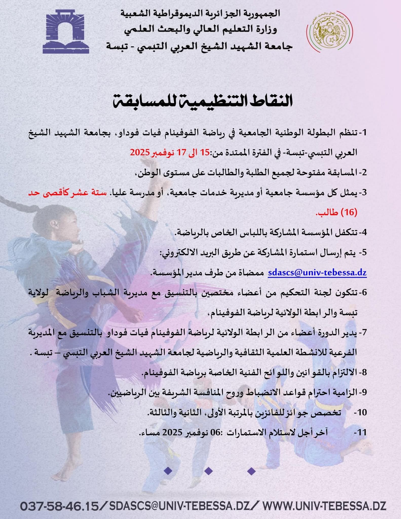 تعلم المديرية الفرعية للانشطة العلمية الثقافية و الرياضية جميع طلبة جامعة حسيبة بن بوعلي الشلف الراغبين في المشاركة و تمثيل الجامعة في البطولة الوطنية الجامعية في رياضة -الفوفينام فيات فوداو- التقرب من مصالح الانشطة العلمية الثقافية و الرياضية على مستوى الكليات و المعهدين أو مقر المديرية الفرعية للانشطة العلمية الثقافية و الرياضية المتواجدة بمديرية الجامعة من أجل التسجيل قبل تاريخ 13 نوفمبر 2025 مرفوقين بالشهادة المدرسية للموسم الجامعي 2026/2025 “.