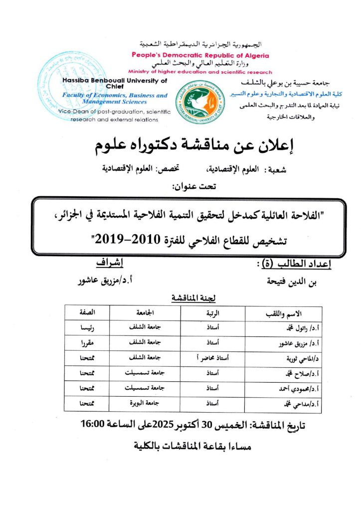 اعلان عن مناقشة دكتوراه تحت عنوان: الفلاحة العائلية كمدخل لتحقيق التنمية الفلاحية المستديمة في الجزائربواسطة zouatenia mhamed / 29 أكتوبر، 2025