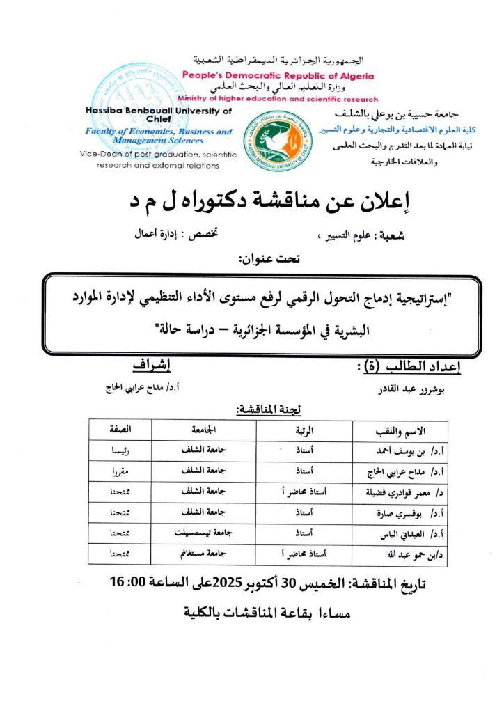 اعلان عن مناقشة دكتوراه تحت عنوان: استراتيجية ادماج التحول الرقمي لرفع مستوى الأداء التنظيمي لإدارة الموارد البشرية في المؤسسة الجزائريةبواسطة zouatenia mhamed / 29 أكتوبر، 2025