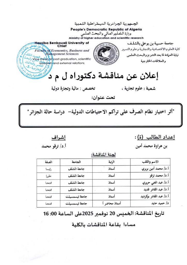 اعلان عن مناقشة دكتوراه تحت عنوان “أثر اختيار نظام الصرف على تراكم الاحتياطات الدولية -دراسة حالة الجزائر-بواسطة zouatenia mhamed / 17 نوفمبر، 2025