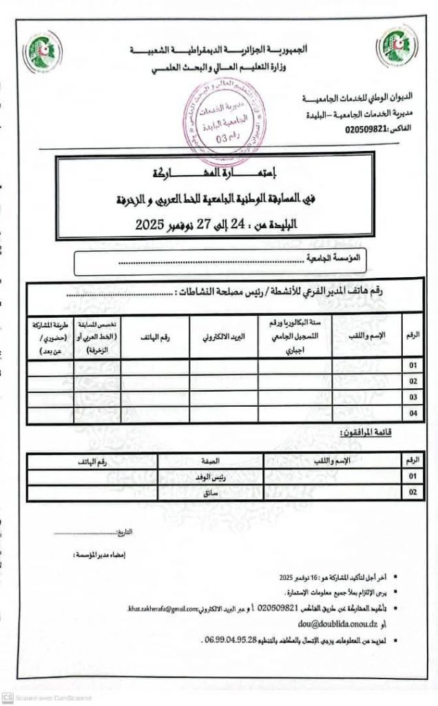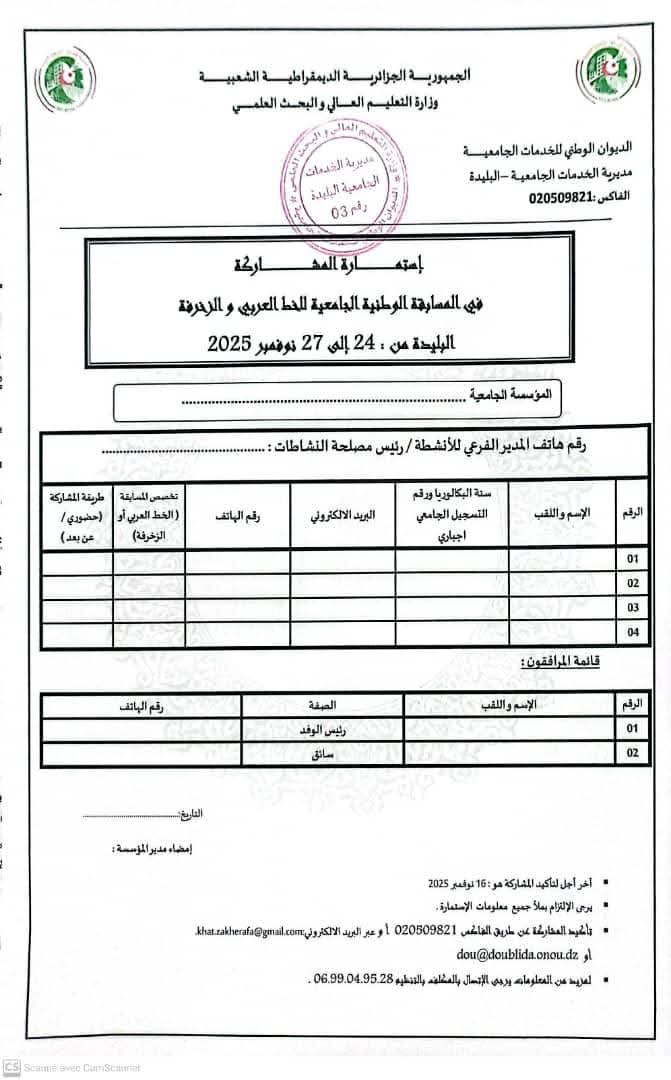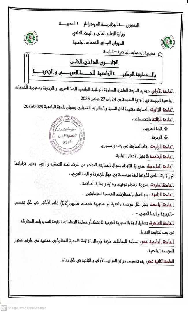 تعلم المديرية الفرعية للانشطة العلمية الثقافية و الرياضية جميع طلبة جامعة حسيبة بن بوعلي الشلف الراغبين في المشاركة و تمثيل الجامعة في الطبعة العاشرة للمسابقة الوطنية الجامعية للخط العربي و الزخرفة التقرب من مصالح الانشطة العلمية الثقافية و الرياضية على مستوى الكليات و المعهدين أو مقر المديرية الفرعية للأنشطة العلمية الثقافية و الرياضية المتواجدة بمديرية الجامعة من أجل التسجيل قبل تاريخ 15 نوفمبر 2025 مرفوقين بالشهادة المدرسية للموسم الجامعي 2026/2025 .
