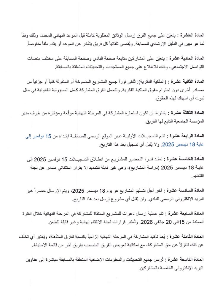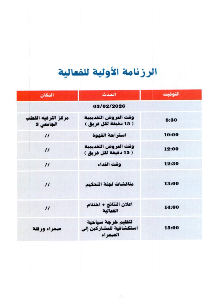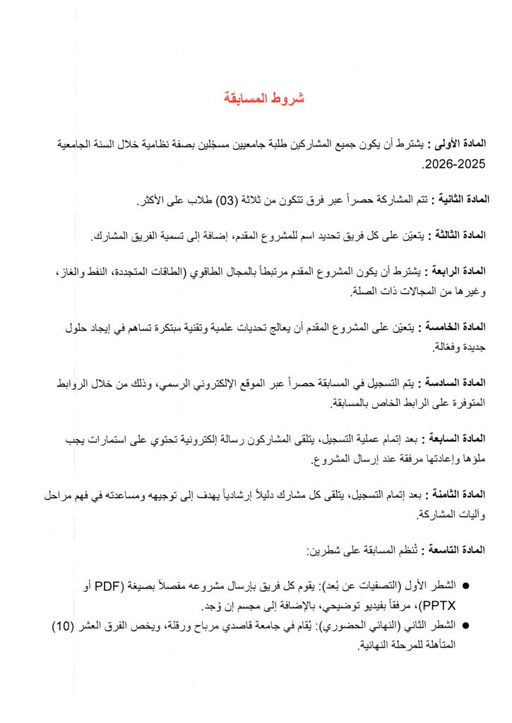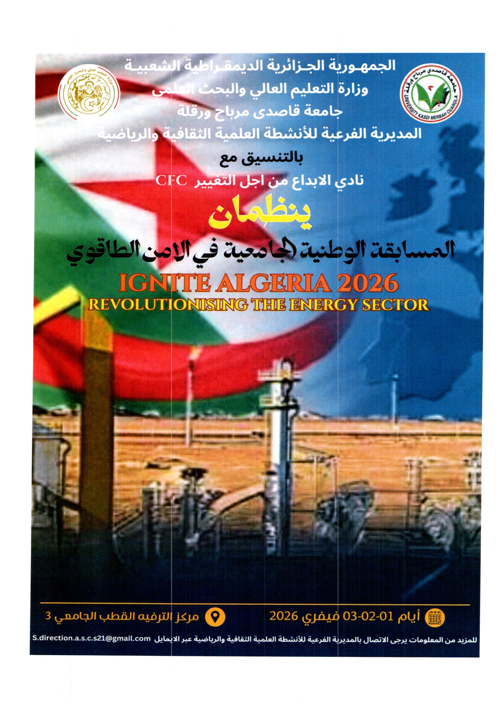 تعلم المديرية الفرعية للانشطة العلمية الثقافية و الرياضية جميع طلبة جامعة حسيبة بن بوعلي الشلف الراغبين في المشاركة و تمثيل الجامعة في المسابقة الوطنية الجامعية في الامن الطاقوي التقرب من مصالح الانشطة العلمية الثقافية و الرياضية على مستوى الكليات و المعهدين أو مقر المديرية الفرعية للانشطة العلمية الثقافية و الرياضية المتواجدة بمديرية الجامعة من أجل التسجيل قبل تاريخ 17 ديسمبر 2025 مرفوقين بالشهادة المدرسية للموسم الجامعي 2026/2025 .
