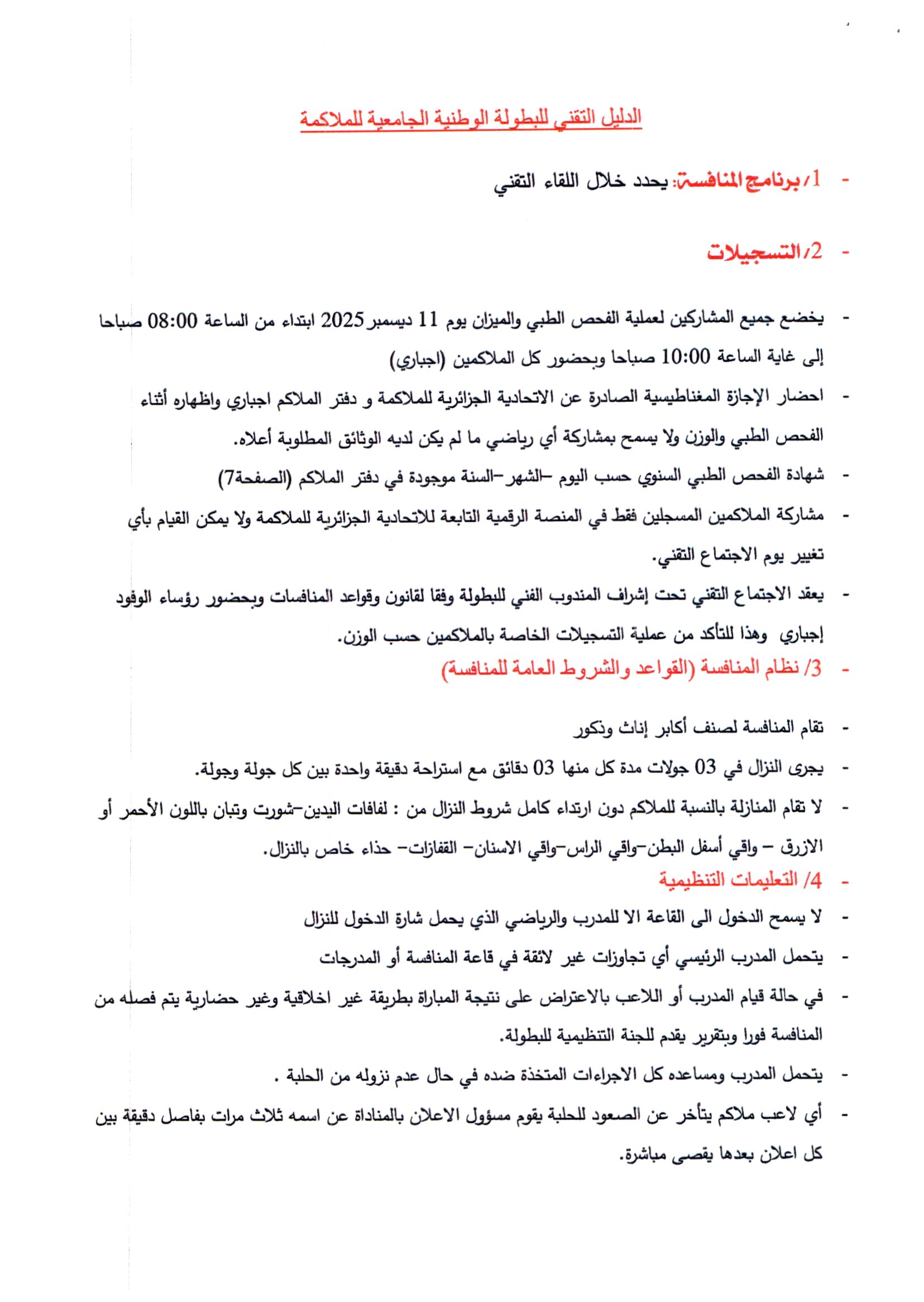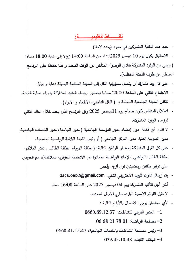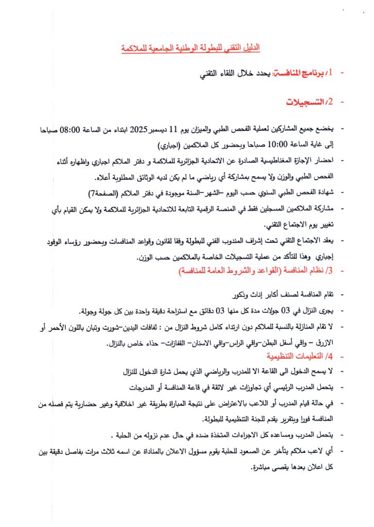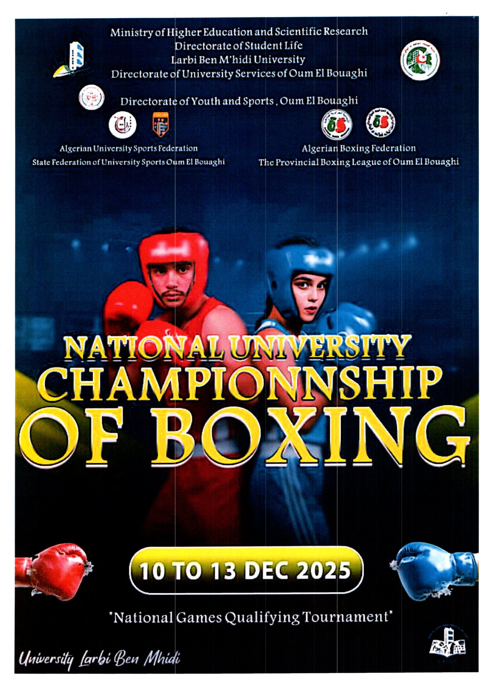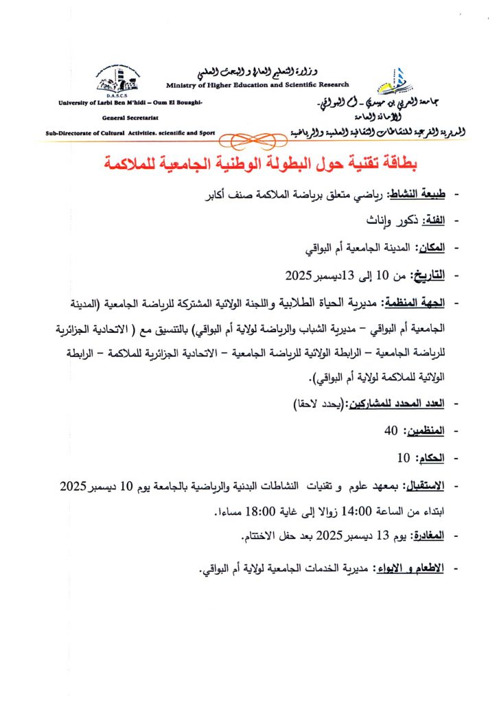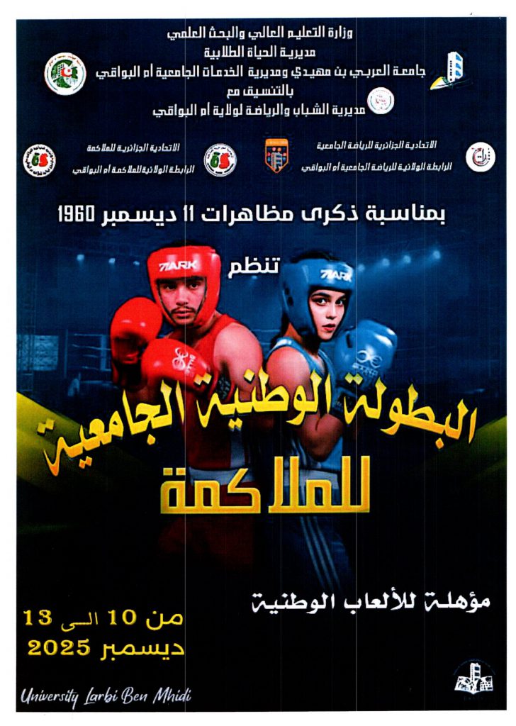 تعلم المديرية الفرعية للانشطة العلمية الثقافية و الرياضية جميع طلبة جامعة حسيبة بن بوعلي الشلف الراغبين في المشاركة و تمثيل الجامعة في للمسابقة الوطنية الجامعية في رياضة الملاكمة التقرب من مصالح الانشطة العلمية الثقافية و الرياضية على مستوى الكليات و المعهدين أو مقر المديرية الفرعية للانشطة العلمية الثقافية و الرياضية المتواجدة بمديرية الجامعة من أجل التسجيل قبل تاريخ 10 ديسمبر 2025 مرفوقين بالشهادة المدرسية للموسم الجامعي 2026/2025 .