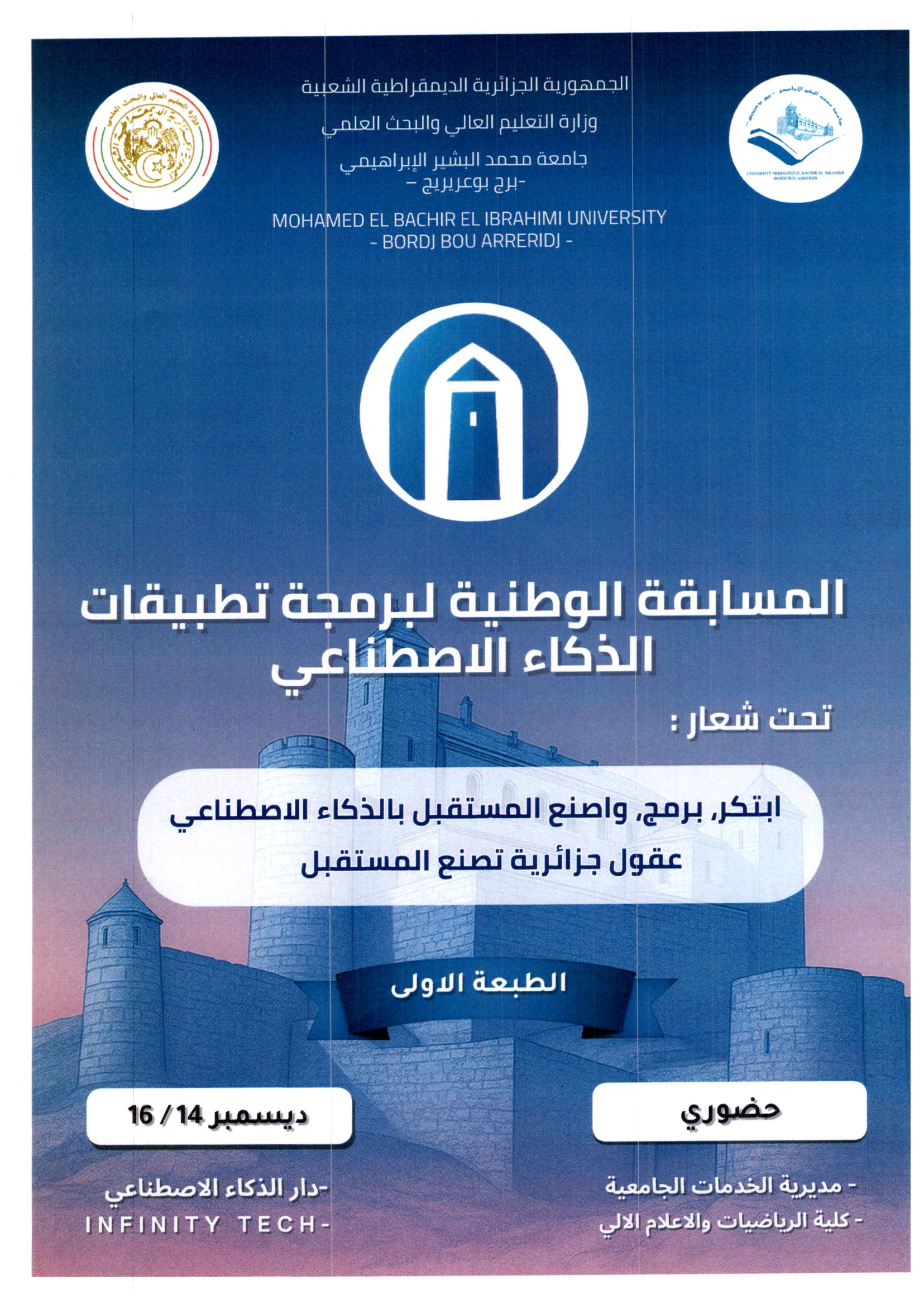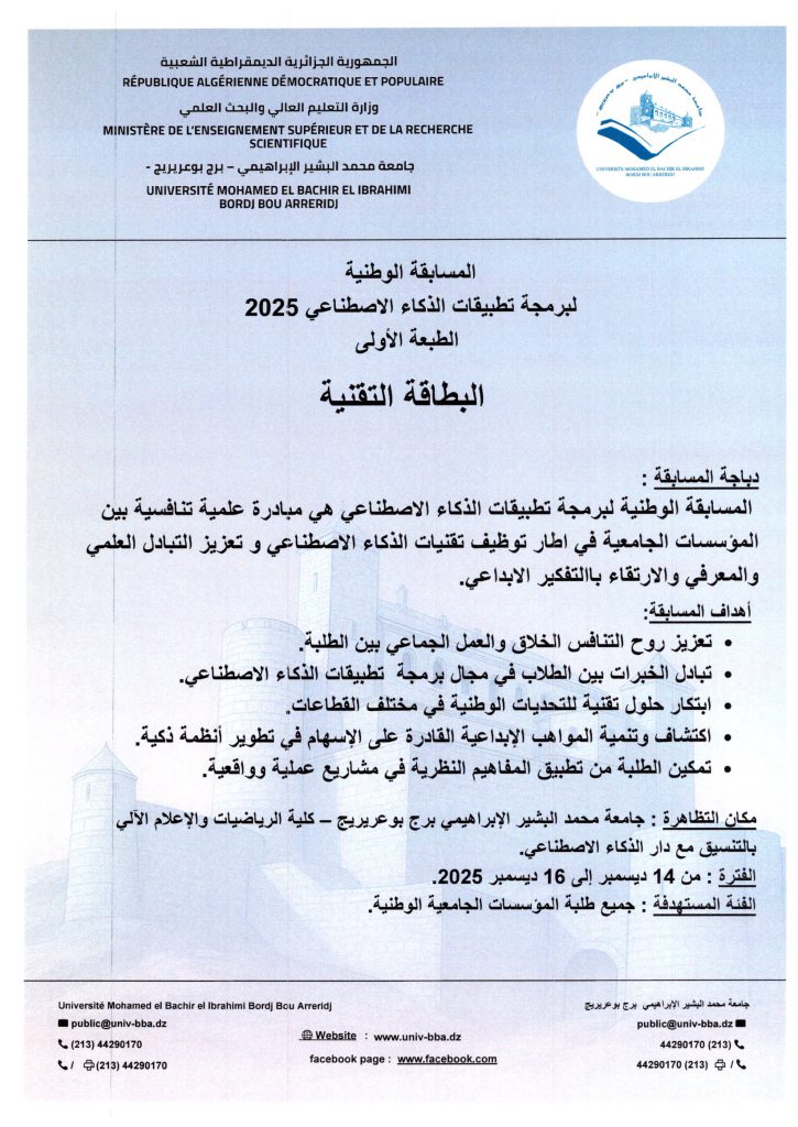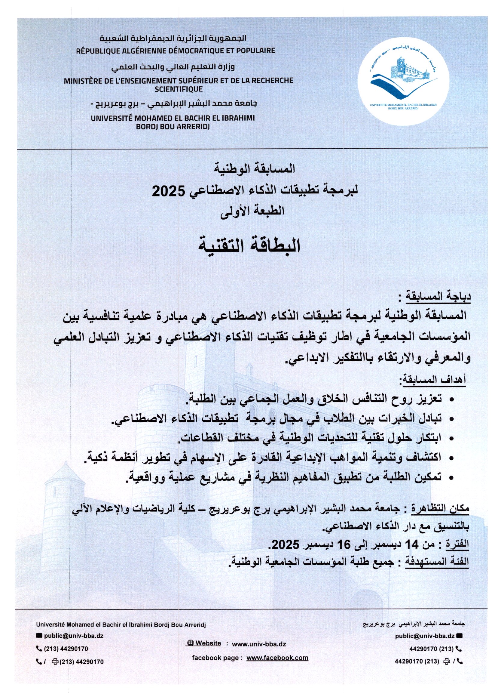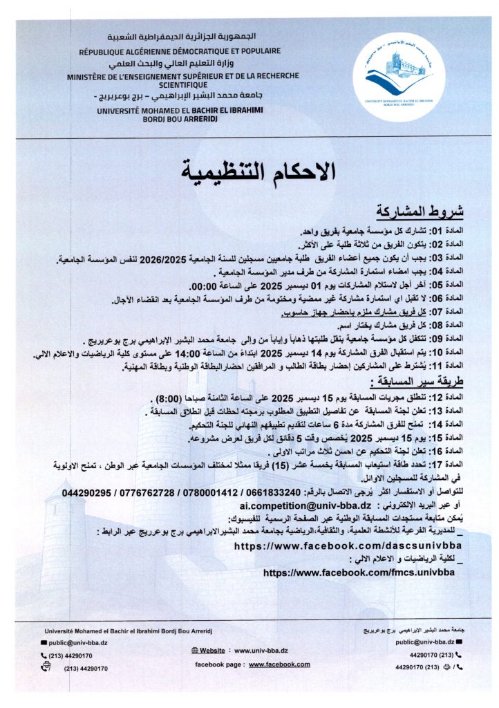 تعلم المديرية الفرعية للانشطة العلمية الثقافية و الرياضية جميع طلبة جامعة حسيبة بن بوعلي الشلف الراغبين في المشاركة و تمثيل الجامعة في الطبعة الاولى للمسابقة الوطنية الجامعية لبرمجة تطبيقات الذكاء الاصطناعي التقرب من مصالح الانشطة العلمية الثقافية و الرياضية على مستوى الكليات و المعهدين أو مقر المديرية الفرعية للانشطة العلمية الثقافية و الرياضية المتواجدة بمديرية الجامعة من أجل التسجيل قبل تاريخ 11 ديسمبر 2025 مرفوقين بالشهادة المدرسية للموسم الجامعي 2026/2025 .