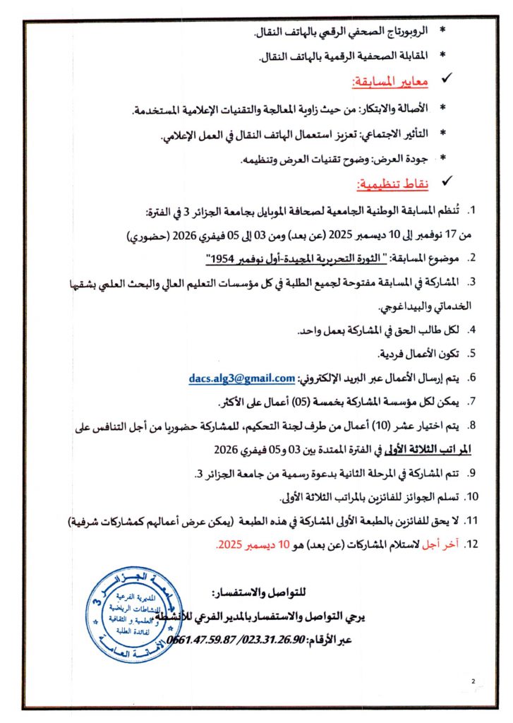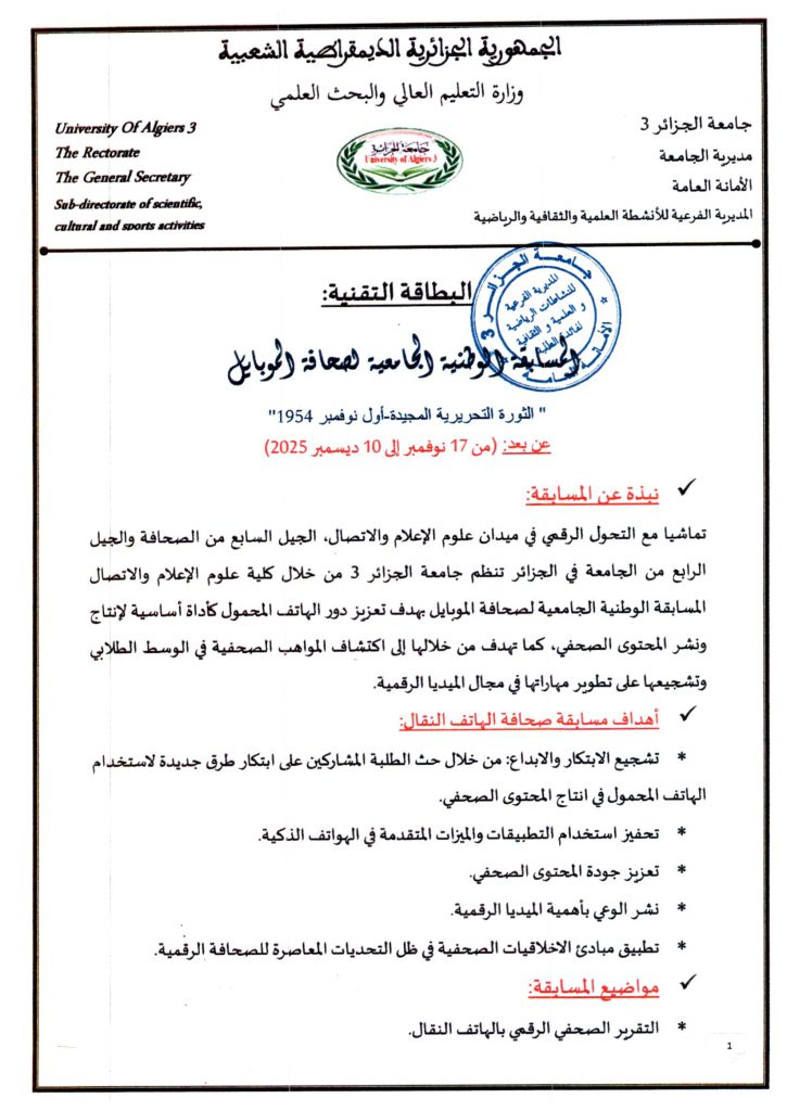 تعلم المديرية الفرعية للانشطة العلمية الثقافية و الرياضية جميع طلبة جامعة حسيبة بن بوعلي الشلف الراغبين في المشاركة و تمثيل الجامعة في الطبعة الثانية للمسابقة الوطنية الجامعية لصحافة الموبايل التقرب من مصالح الانشطة العلمية الثقافية و الرياضية على مستوى الكليات و المعهدين أو مقر المديرية الفرعية للانشطة العلمية الثقافية و الرياضية المتواجدة بمديرية الجامعة من أجل التسجيل قبل تاريخ 10 ديسمبر 2025 مرفوقين بالشهادة المدرسية للموسم الجامعي 2026/2025 .