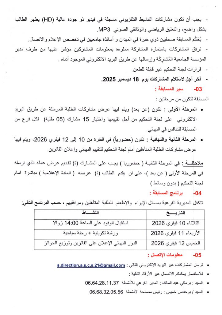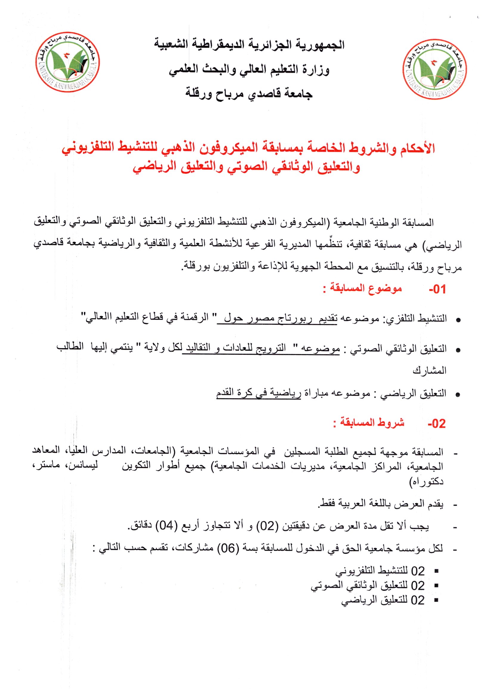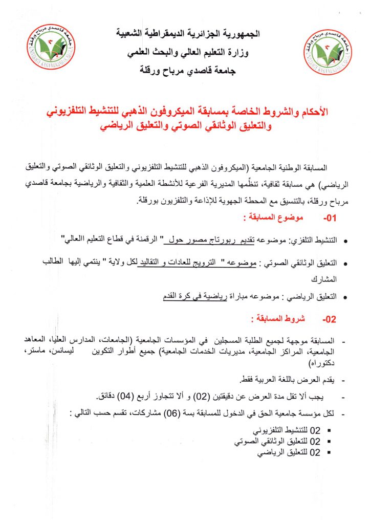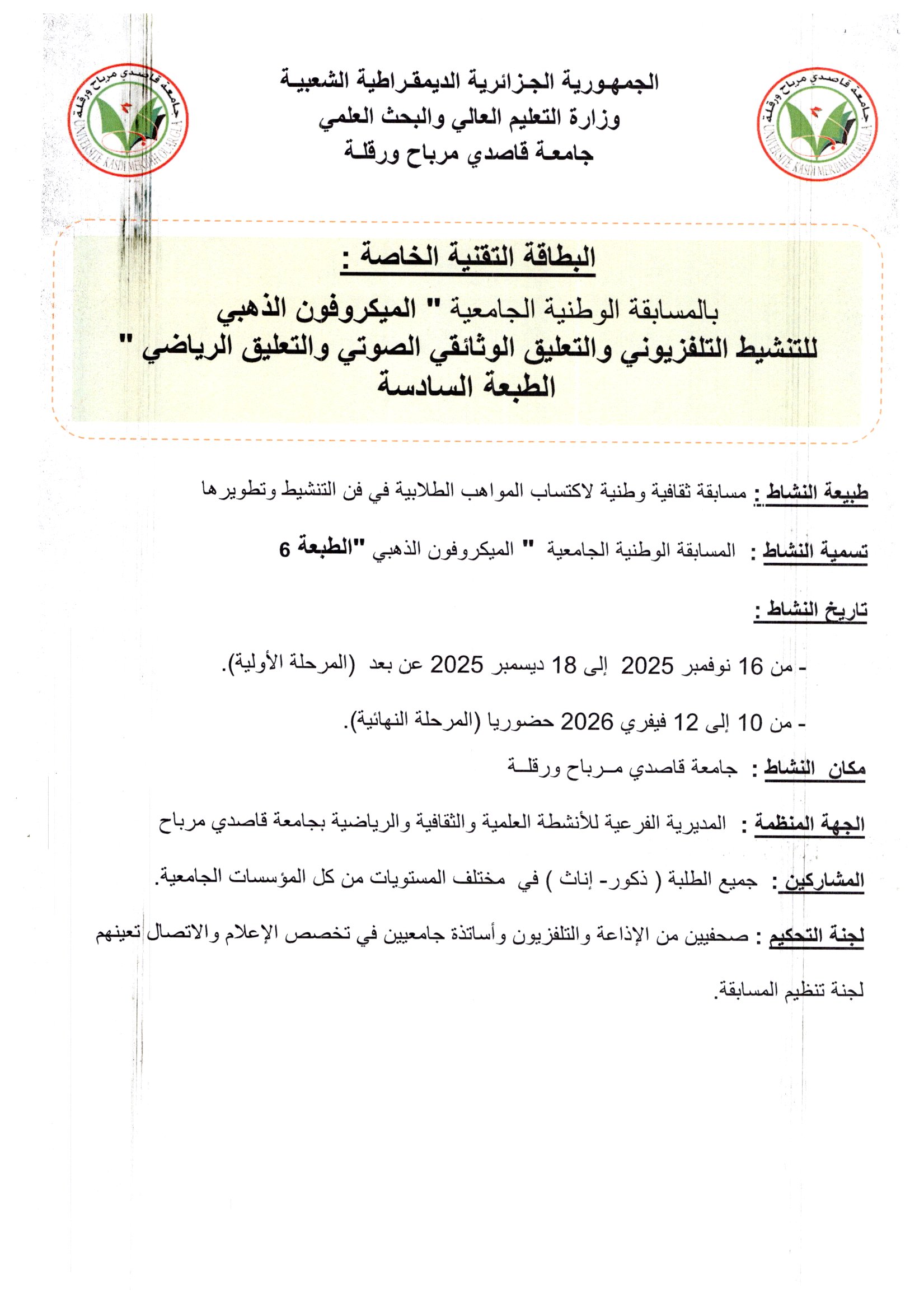 تعلم المديرية الفرعية للانشطة العلمية الثقافية و الرياضية جميع طلبة جامعة حسيبة بن بوعلي الشلف الراغبين في المشاركة و تمثيل الجامعة في الطبعة السادسة للمسابقة الوطنية الجامعية الميكروفون الذهبي التقرب من مصالح الانشطة العلمية الثقافية و الرياضية على مستوى الكليات و المعهدين أو مقر المديرية الفرعية للانشطة العلمية الثقافية و الرياضية المتواجدة بمديرية الجامعة من أجل التسجيل قبل تاريخ 17 ديسمبر 2025 مرفوقين بالشهادة المدرسية للموسم الجامعي 2026/2025