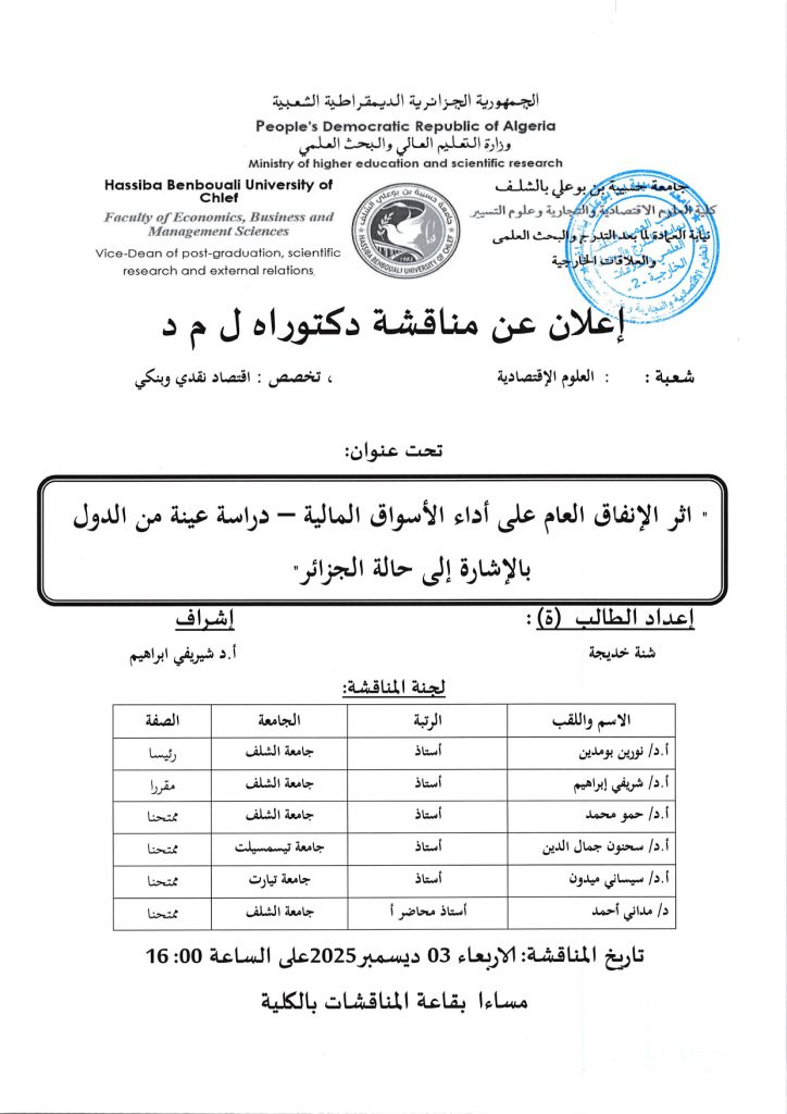 اعلان عن مناقشة دكتوراه: أثر الانفاق العام على أداء الأسواق الماليةبواسطة zouatenia mhamed / 28 نوفمبر، 2025