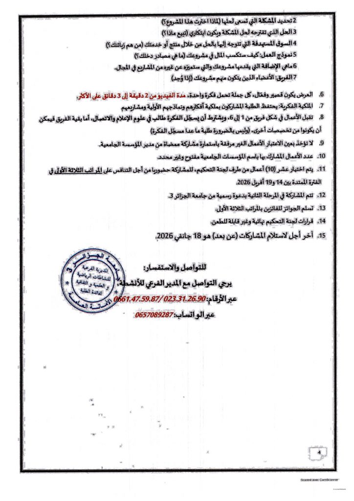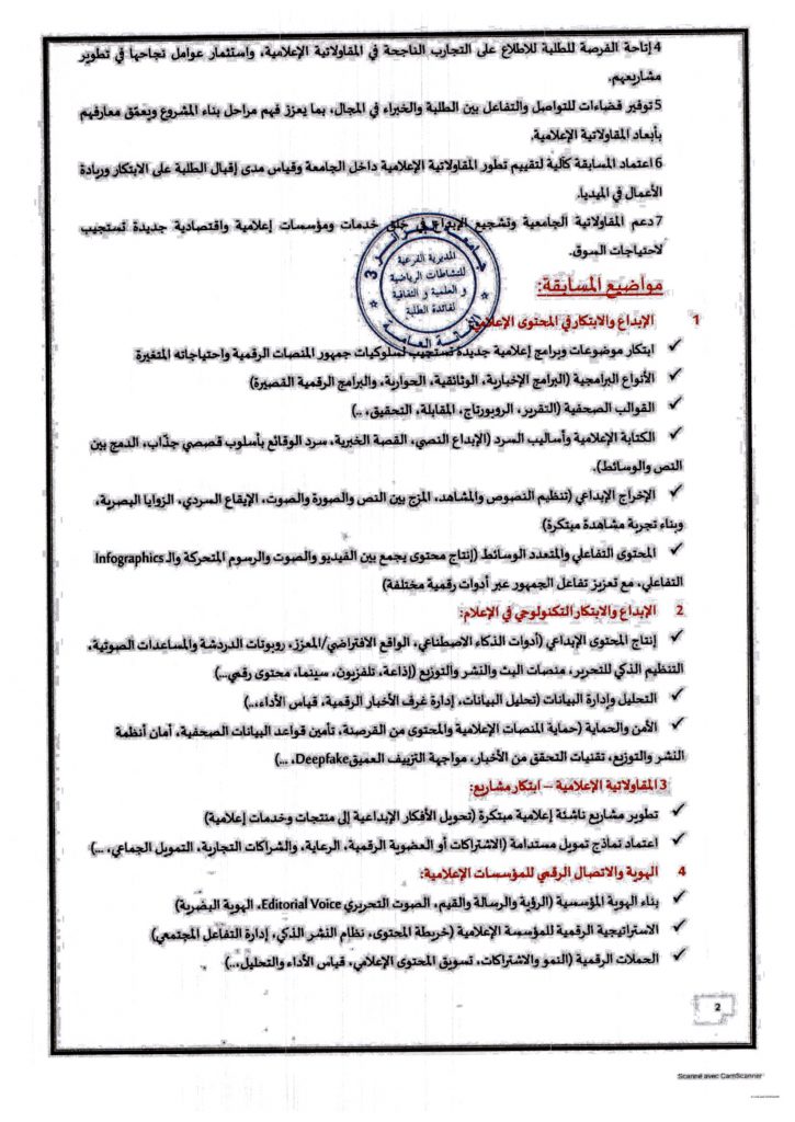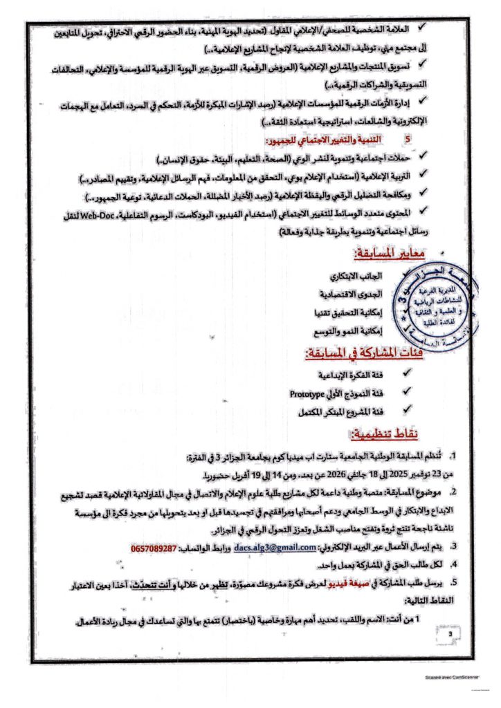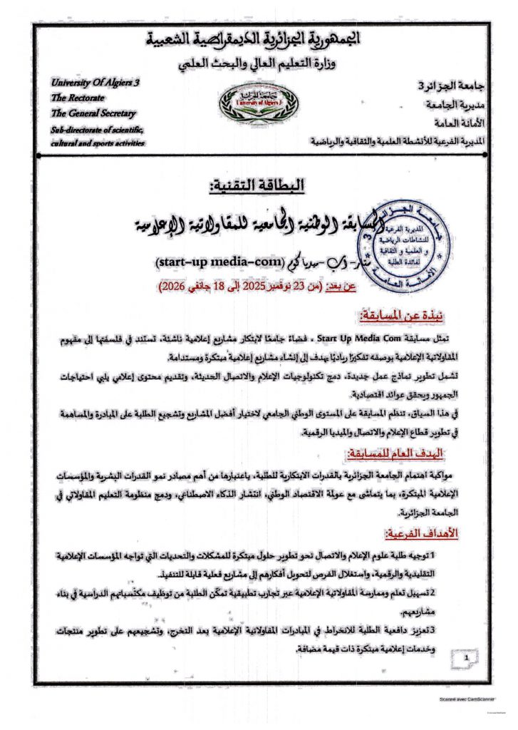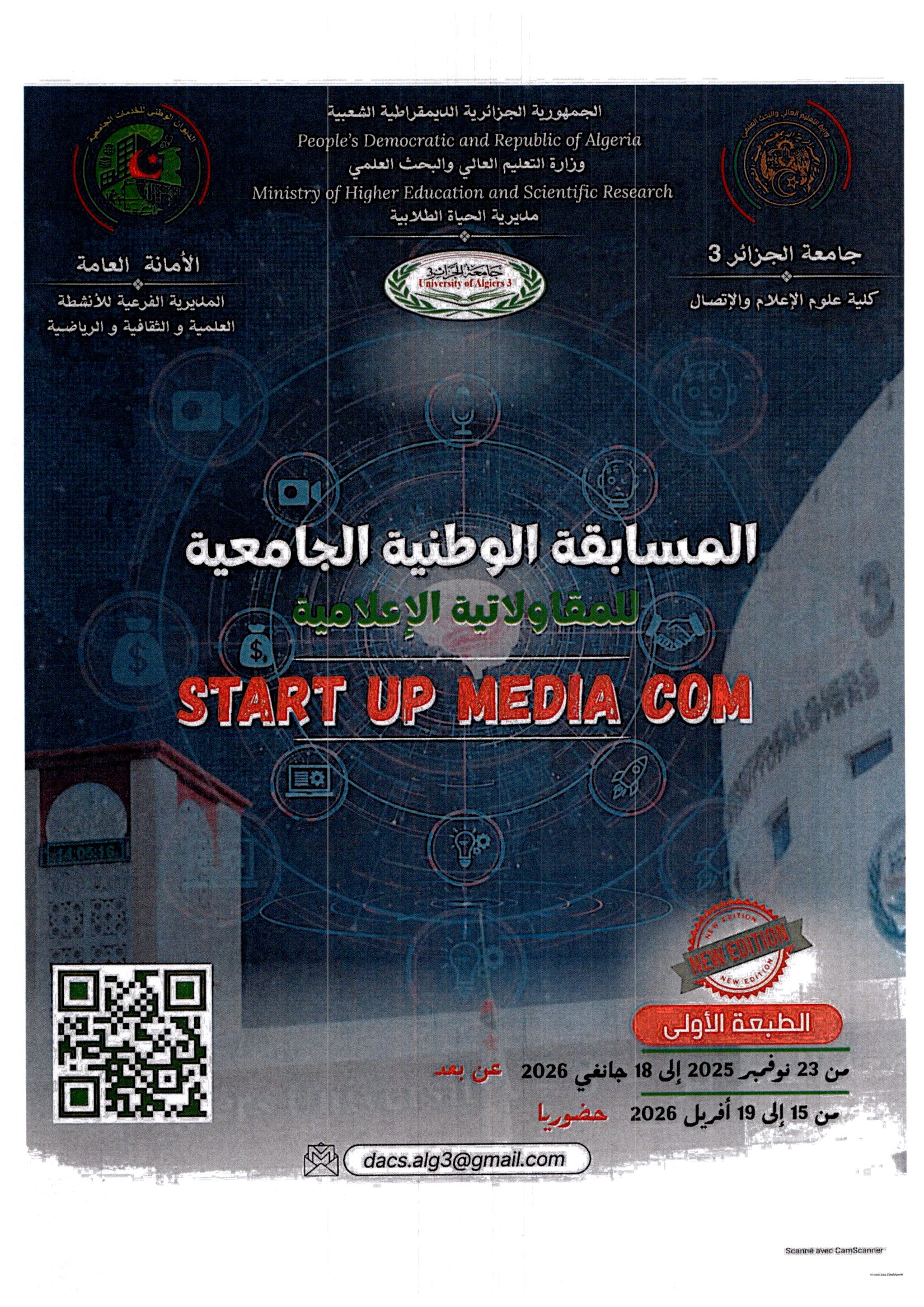 المسابقة الوطنية الجامعية للمقاولاتية الاعلامية START UP MEDIA COMبواسطة zouatenia mhamed / 30 نوفمبر، 2025