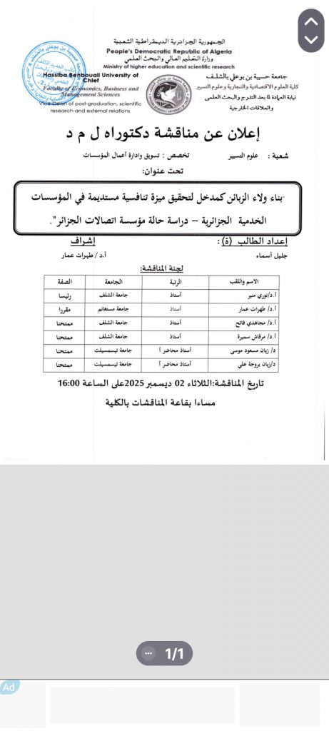 اعلان عن مناقشة دكتوراه تحت عنوان : بناء ولاء الزبائن كمدخل لتحقيق ميزة تنافسية مستديرة في المؤسسات الخدمية الجزائريةبواسطة zouatenia mhamed / 2 ديسمبر، 2025