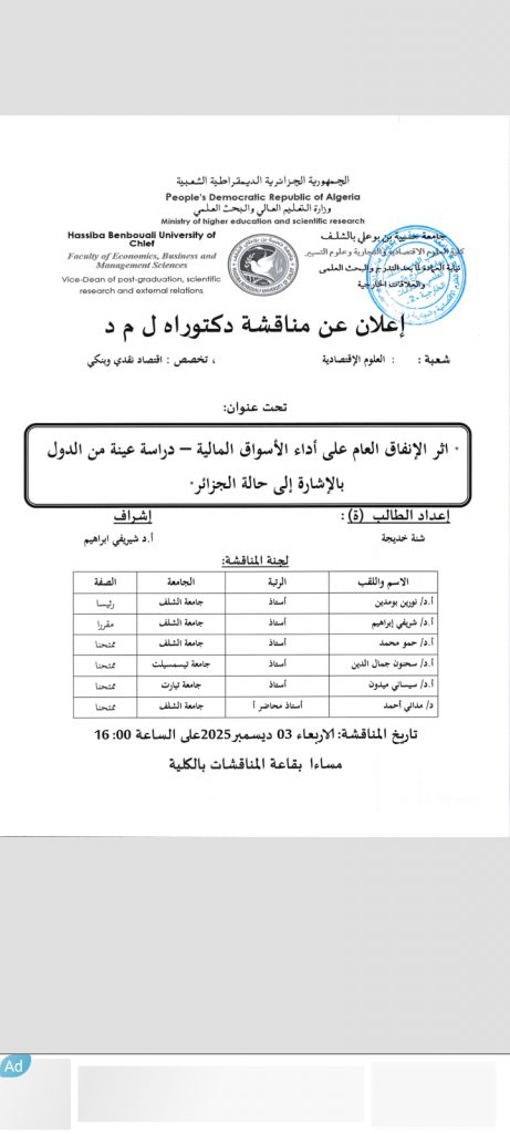 اعلان عن مناقشة دكتوراه تحت عنوان: أثر الانفاق العام على أداء الأسواق الماليةبواسطة zouatenia mhamed / 2 ديسمبر، 2025