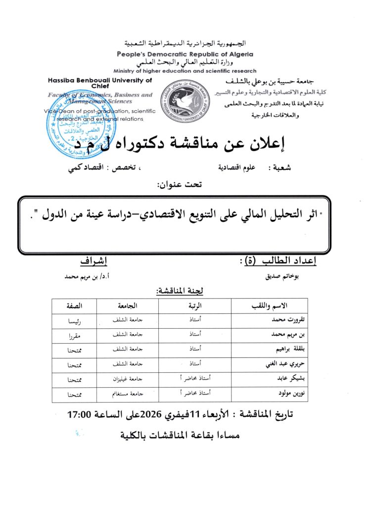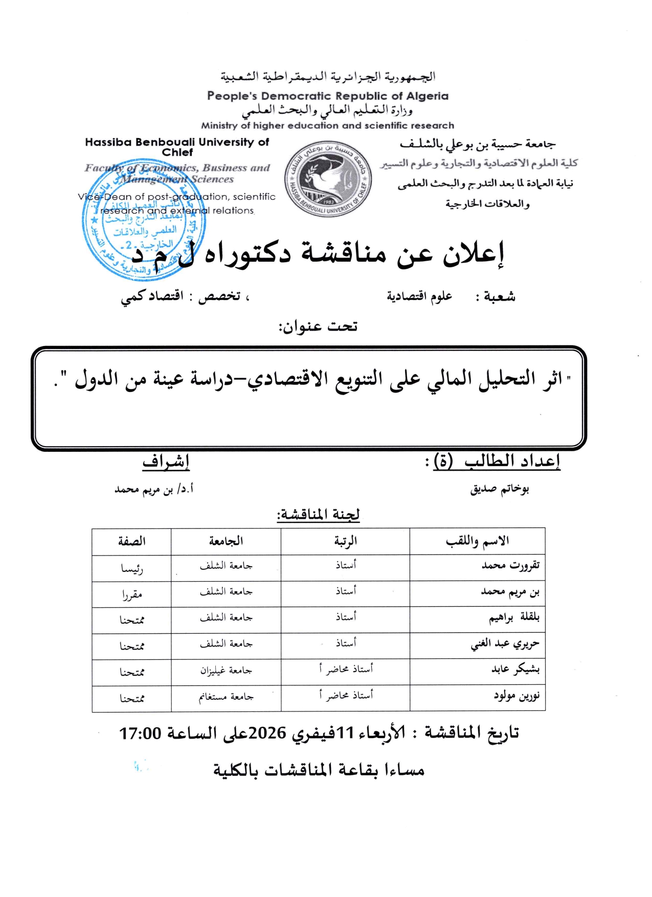 اعلان عن مناقشة دكتوراه تحت عنوان أثر التنويع المالي على التنويع الاقتصادي -دراسة عينة من الدولبواسطة eco-admin / 10 فبراير، 2026 الاعلان بوخاتم صديقتنزيل