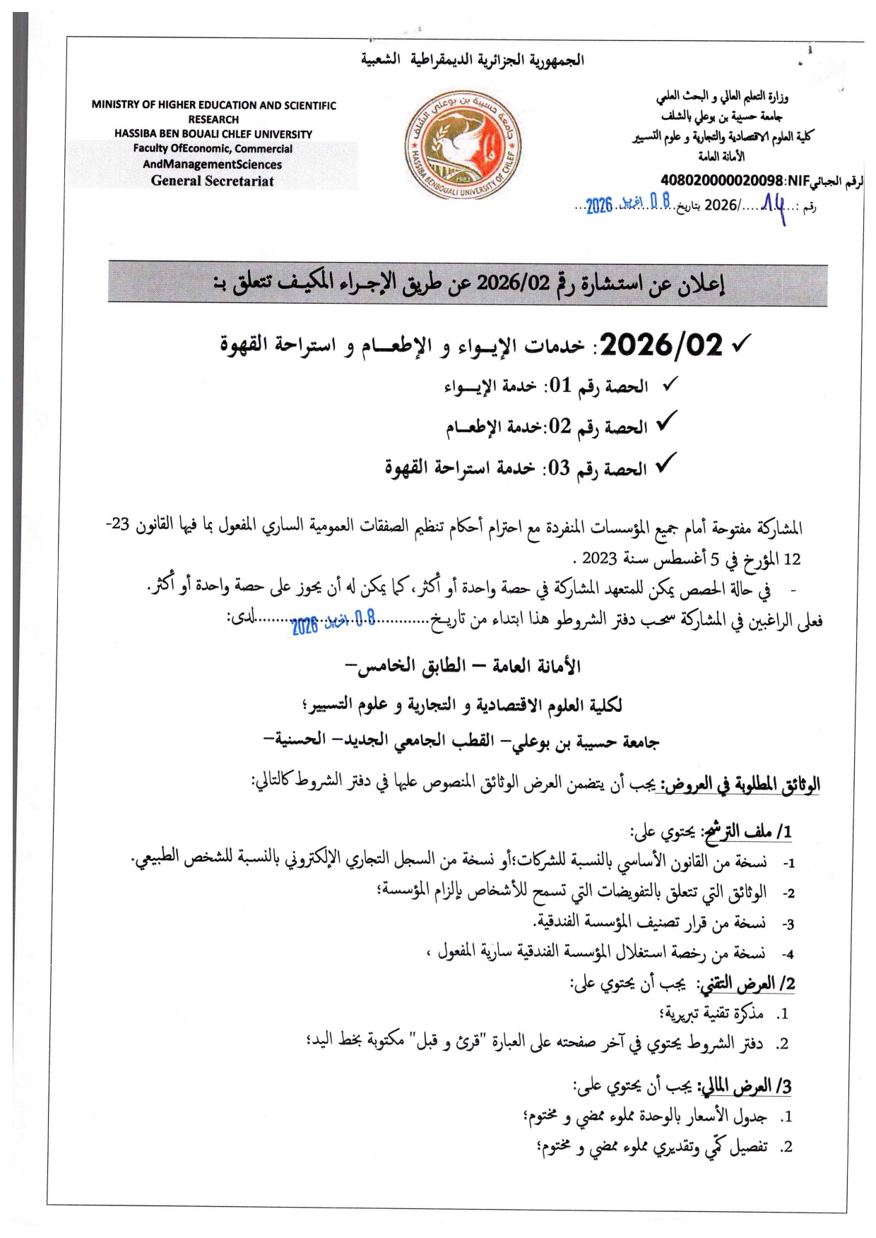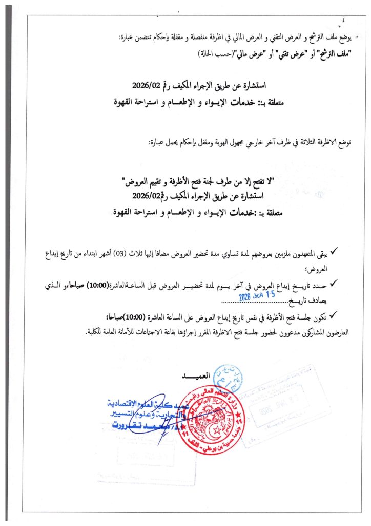 اعلان عن استشارة رقم 02/2026 عن طريق الاجراء المكيف تتعلق ب: خدمات الايواء و الاطعام و استراحة القهوة 8 أبريل، 2026 20260408_12470589تنزيل